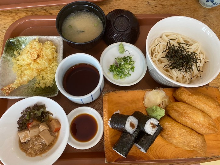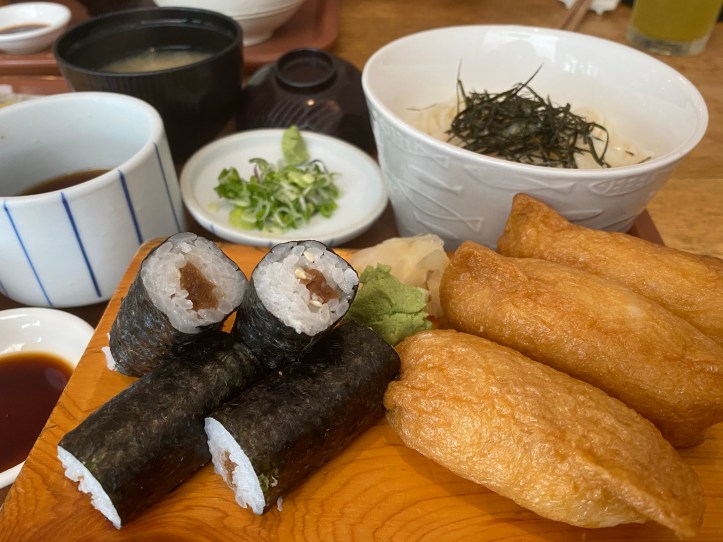 こちらはつけ麺タイプのおうどんと稲荷&鉄火巻き。