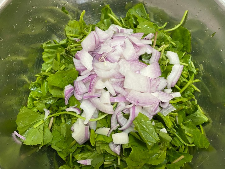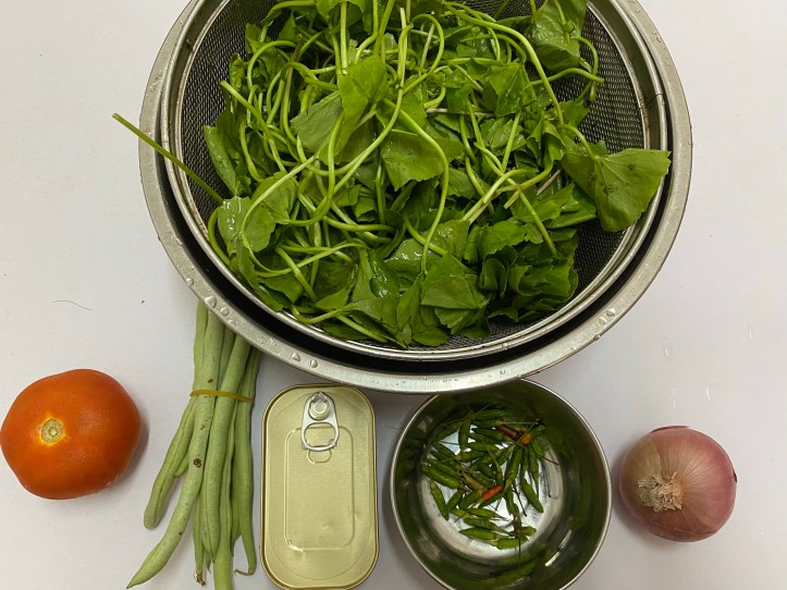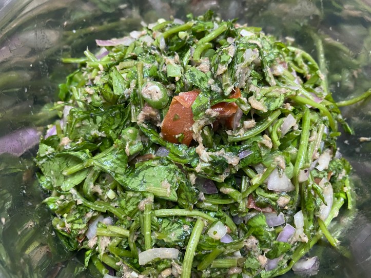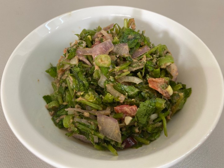 マレーシアではパガガの葉っぱを食べやすいサイズに切って、刻んだ赤タマネギやチリ、イカンビリス(小魚のフライ)、ブラチャン(エビを発酵させた醤油)等を混ぜて和えます。
