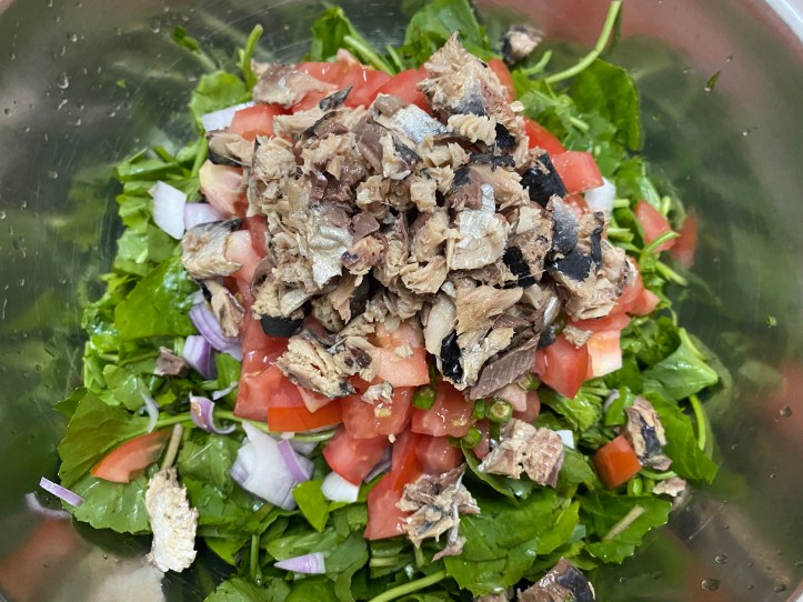 パガガ、トマト、インゲン豆、生チリ、赤タマネギ、そして鯖缶です。