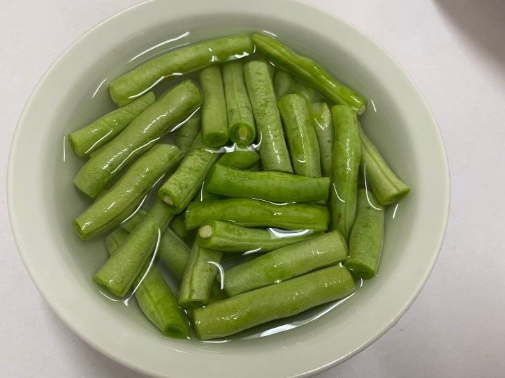 インゲンは少し茹でるか、さっと湯煎に通すくらいの固さにして刻んで入れます。