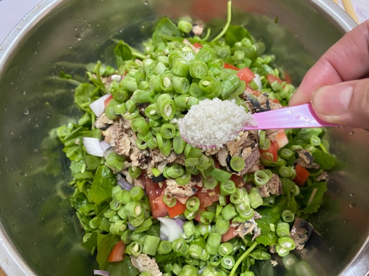 マレー人の場合はイカンビリスと言って、小魚のフライを入れるそうですが今回は鯖缶を使ってみました。