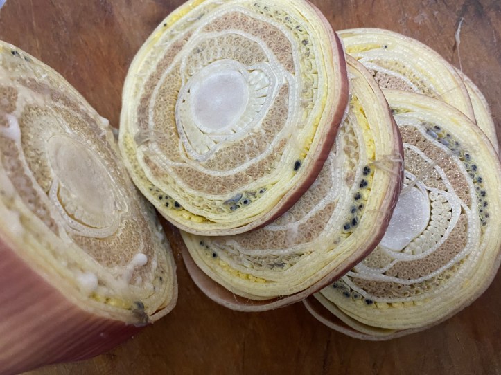 まずはバナナの花を輪切りで1センチ弱くらいの幅に切っていきます。