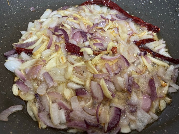 タマネギを小さく切ったもの(薄いスライスでも可)、ニンニクもスライスして、ドライチリはそのまま一緒にフライパンで炒めます。