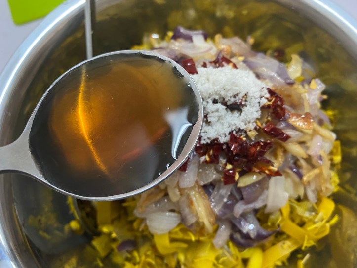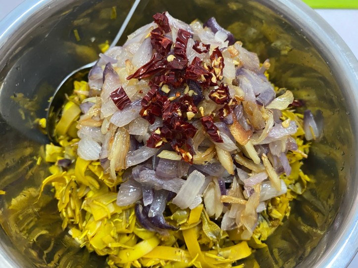 今回は塩水にさらしておいたスライスタマネギとパクチーを混ぜてみました。