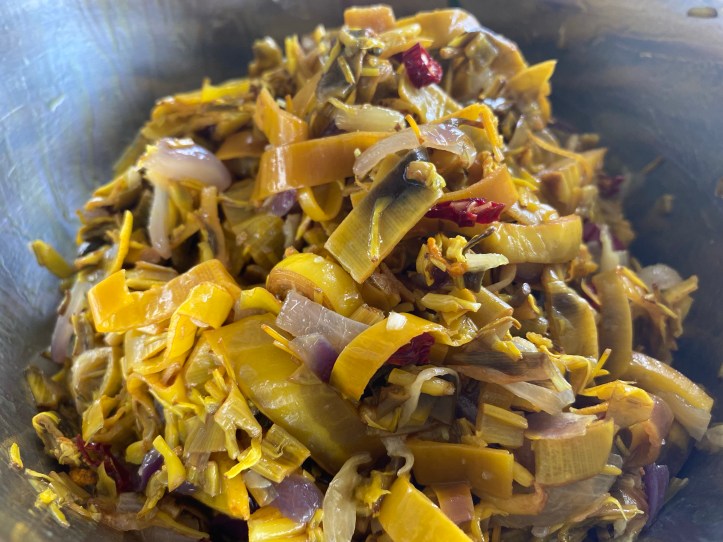 この時にターメリックパウダーを大さじ1杯入れて一緒に茹でます。