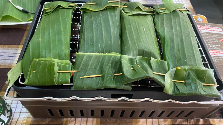 中には魚のベースのパテが入っており、炭で焼き鳥のように焼いて食べます。
