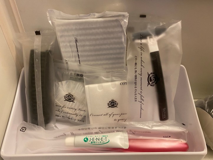 アメニティはカミソリ、コットン、歯ブラシ、クシ、体を洗うスポンジタオル。